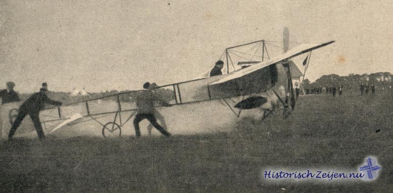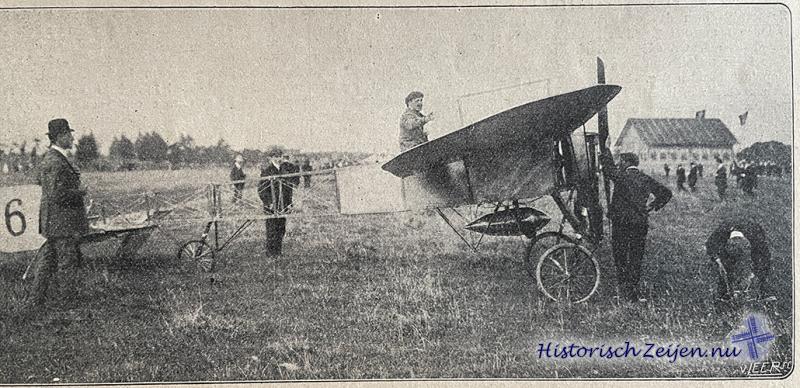 Het terrein ziet er keurig uit. De ruimte waar gevlogen wordt is een afgepaald weiland van ruim 5 H.A. grootte, de paaltjes wit geverfd om den aviateur van boven uit zijn terrein goed te doen kennen, tot welk doel ook dient een witte kalklijn midden over het land. De greppels zijn met planken belegd, zoo dat het geheel een goed effen terrein is. In de hangar, de loods, is het toestel opgeborgen. Het is een Blériotmonoplane, dus met één zweefvlak, wegende 280 kilo's, is voorzien van een Gnomemotor van 60 paardekrachten ; het vliegt met een snelheid van 90 à 100 kilometer in het uur en kost 22000 francs. Rond het terrein de eerste en tweede rang, ververschingsgelegenheden en verder de tribune voor de vliegcommissie en genoodigden, waaronder we opmerken den heer J. G. Scholten, eere-voorzitter van de commissie, civiele- en militaire autoriteiten, waaronder de kolonel-garnizoens-commandant van Assen.