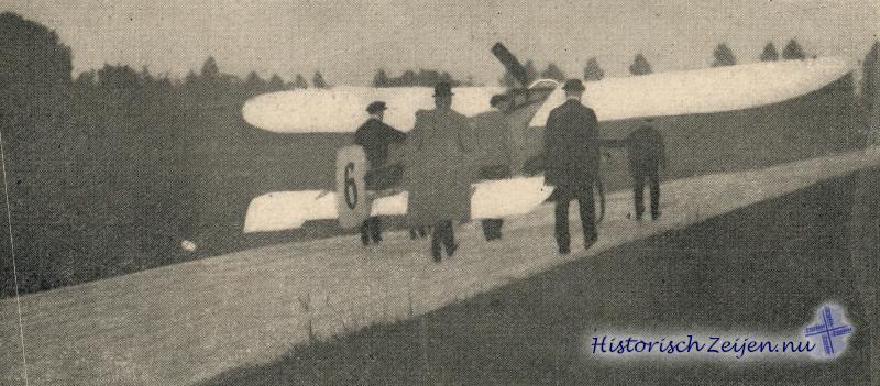 Tegen vijf uur wordt het toestel naar buiten gebracht en wordt de motor aan de gang gemaakt. We zijn in spanning. We denken dat het toestel dat driftig vooruit wil, maar tegengehouden wordt door helpers, direct bij loslaten weg zal schieten als een pijl uit den boog ; ten minste de schroef snort als een razende rond. Maar neen onze verwachting wordt teleurgesteld, want Olieslagers heeft enkel de motor willen probeeren en laat nu z'n toestel weer opbergen. Wel was de bedoeling dat er om vijf uur gevlogen zou worden maar de wind is nog te sterk en Olieslagers zegt dat hij zal gaan vliegen als de commissie het wenscht, maar een klein incident is dan niet uitgesloten en dat heeft hij liever niet, daar hij bij zijn eerste vlucht boven onzen bodem reeds direct het Nederlandsch record van van Maasdijk, die ruim 27 minuten vloog, wil verbeteren. Nu wordt ons geduld lang op de proef gesteld, want aan de zwart-geel-roode vlag, dié op de hangar geheschen is, is wel te zien dat de wind luwt, maar nog niet voldoende.